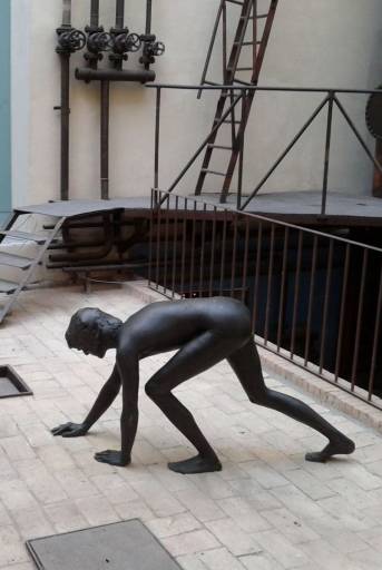 D’altronde i procedimenti concettuali ed operativi di Demetz sono un punto di forza, e si rivelano interessanti già solo leggendoli “sulla carta”, nei totem disposti ad illustrazione di ogni gruppo scultoreo: tra tanta manualità di livello, colpisce la negazione del tocco umano in figure realizzate meccanicamente – Advanced minorities – forse quasi più delle escrescenze (funghi o peluria legnosa) presenti sui loro corpi; che Demetz non sia artista pedissequamente attaccato alle “consuetudini operative” lo si evince anche dal doppio uso che fa del bronzo, liscio e totalmente classico in Homo Erectus, alternativo ne I Radicanti, post carbonizzazione e che di quest’ultima imita minuziosamente le caratteristiche, rendendo difficile accorgersi di un trompe l’oeil materico in gran parte dovuto a funzioni pratiche (il bronzo è più resistente e durevole del legno carbonizzato), ma che per resa finale stupisce veramente. E infine, in un ambiente come la Pelanda ci si può permettere degli azzardi espositivi molto scenografici: bisogna alzare lo sguardo per osservare Heimat, grande scultura appesa alla struttura dei binari che un tempo trasportavano gli animali macellati, esempio di un perfetto utilizzo/riconversione a scopo espositivo di elementi preesistenti.