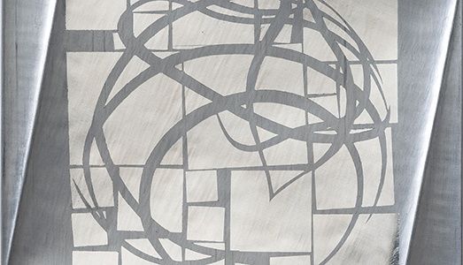 Mentre Domenico Bianchi (Anagni, 1955) presenta una composizione di olio, cera e palladio su fibra di vetro, articolando su una superficie bianca la sua variabile segnica, un raffinato motivo di vaga assonanza optical, Nunzio (Cagnano Amiterno, 1954) propone una consueta scultura a parete di legno combusto, in cui sottili sagome parallele si susseguono in un ritmo potenzialmente infinito, animandosi negli interstizi grazie al vigore cromatico del blu elettrico, nota cromatica cara all’artista e da lui più volte utilizzata. Un confronto tra bianco e nero, tra espansioni di superficie e propensioni scultoree, che sonda le potenzialità espressive di materiali eterogenei in un’atmosfera amichevole ma rigorosa. Ma la vera sorpresa della mostra – peraltro annunciata proprio in questi termini dallo stesso Pio Monti – è l’opera realizzata dai due artisti a quattro mani, un pezzo unico più che una rarità. Su un bassorilievo in piombo di Nunzio, connotato dall’andamento concavo-convesso di forme minimali, Bianchi ha apposto il suo caratteristico motivo geometrico di quadrati e linee curve che si confondono in sovrapposizioni e dissolvenze, connotando l’opera al punto da rendere possibile un rispecchiamento tra questa e l’altra totalmente autografa. Un’osmosi perfettamente riuscita, che le forme a stento diradano mentre la luce definisce ed esalta. Osservandola vi si rintracciano le parole scritte da Achille Bonito Oliva nel testo di presentazione: “L’artista in duetto traccia insieme lo spazio e il segno, che ripropone la sua cifra evidente, senza mistero se non quello della propria esistenza splendente. Il segno non emerge, infatti, dalla positività storica, ma si è costituito affiorando alla forma non come tentativo di rassomigliare il mondo, ma come atteggiamento di totalità e di autosignificazione”.