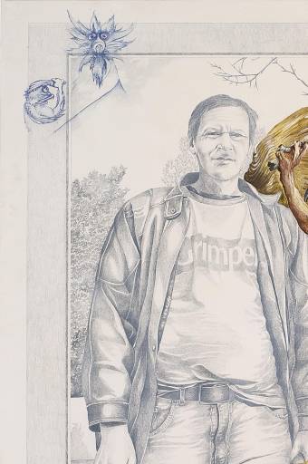 Ciascun ritratto, come sintetizza Ruffo, “è un po’ la riproduzione di quello che si trova sulla scrivania di un analista: libri, cartelle mediche… I suoi strumenti d’indagine”. Abbiamo: il soggetto, il suo profilo medico, il suo ambiente, le sue fobie. Abbiamo, cioè, Camille, Jean-Luc, Gérardine, Pascale, Georges, Malika; e la personale patologia descritta dal brano estrapolato da un trattato scientifico, il padiglione presso il quale soggiornavano, figure mostruose a colori calate in una vegetazione che appare in filigrana. Una sorta di anamnesi. Piuttosto, un breve racconto della loro vita. Il tutto costruito attraverso velature che, sovrapponendosi l’una sull’altra con media diversi (grafite, inchiostro, gesso e pittura), creano quella profondità trasversale, in senso letterale, quello spessore materiale e psicologico. Ciò che non li rende dei monocromi sono i ritagli a colori di figure mostruose. Durante i laboratori con i pazienti, a Ruffo è infatti venuto in mente di andare con loro a visitare il Musée d’Unterlinder, che conserva la strepitosa pala d’altare d’Issenheim di Matthias Grünewald. Uno stupefacente polittico che, già nel Cinquecento, veniva usato per la cura del fuoco di sant’Antonio.