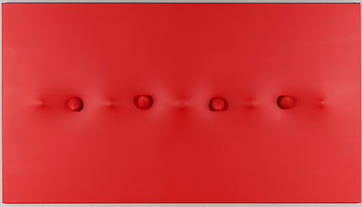 Pittura oggettuale azzardò Gillo Dorfles e la definizione piacque a Bonalumi che la adottò cogliendovi in nuce il senso della propria ricerca estetica: il quadro non più luogo di rappresentazione figurale o aniconica ma struttura “ambigua” progettata come oggetto nello spazio. Dove questa ambiguità coinvolge vari livelli dell’opera. La tela dipinta aggetta nello spazio estroflettendosi secondo un preciso progetto geometrico presentando qualità scultoree e architettoniche oltre che pittoriche. Ed al colore –  non più consueto veicolo di cangianti stati emozionali – è affidato il compito di dare forma alla luce incidente sulla superficie monocroma modulata dal gioco sapiente delle ombre e degli aggetti. Però l’impianto razionale dell’opera malcela il torrente emotivo, linfa vitale di ogni artista, che vive e si agita in quelle controllate tensioni che innervano la tela e le conferiscono, sinesteticamente, una qualità tattile. Davanti a un “Rosso” o ad un “Nero” di Bonalumi  non lambicchiamoci dunque a chiederci ” cosa rappresenta?” ma sentiamoci piuttosto invitati ad interrogarci sul senso e sulla natura di quella misteriosa ovvietà che chiamiamo spazio.