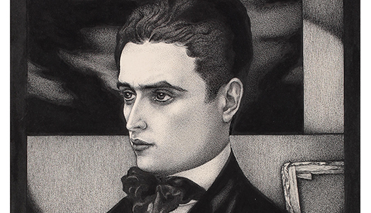 Fu celebre come illustratore di Poe, di Shakespeare e di Dante. Espose a Venezia, Parigi, Londra, Milano, Roma, Berlino, Monaco e Torino dove incontrò e conobbe Vittorio Pica, critico d’arte e direttore della rivista Emporium, che lo apprezzò e lo sostenne contribuendo decisamente alla sua fama. Fu, per formazione e per visione, un artista europeo più che italiano e forse per questo patì in patria – ancora vivente- il dolore dell’oblìo. Singolare la sua idea- mai realizzata- del Tetiteatro (1923), un teatro terracqueo mobile dedicato alla mitica dea marina Teti e di cui restano numerosi disegni e scenografie. In mostra nella galleria Apolloni una sessantina di opere, la maggior parte in nero di china, tecnica in cui Martini eccelleva. Tra queste, attirano la nostra attenzione le inquietanti maschere in china acquerellata di uno sconosciuto “poema delle ombre” e, per l’insolita vivacità cromatica, il ritratto dell’attrice Jenny Colon ispiratrice di “Aurélia” l’ultimo romanzo visionario di Gérard de Nerval. Ci piace di quest’opera il ricercato contrasto tra il clima onirico, fluttuante della scena e la ferma, geometrica, lapidea presenza ispiratrice.