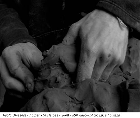 Dimenticate gli eroi. Dimenticatene l’effigie. Nei video di Paolo Chiasera (Bologna, 1978), le statue in creta che raffigurano quattro insigni personaggi del Novecento -Adam Smith, Le Corbusier, Seymour Cray, Noam Chomsky- girano su se stesse fino all’autodistruzione. Non restano che frammenti, scomposti ulteriormente fino a creare un impasto informe, mescolato e poi rimodellato. Ogni canale della video-proiezione racconta i quattro passaggi di questo percorso demolitore, scandito da gesti ripresi in primissimo piano.