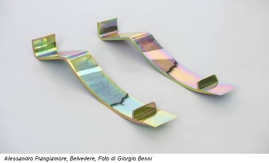 Strettamente correlata ai lavori in cemento è la serie Belvedere composta da inedite prove scultoree dell’artista, nate con la funzione di supporto per le opere di Ikebana e poi divenute opere a sé stanti, quale ulteriore conferma dell’imprevedibilità dell’ispirazione e del gesto artistico. Pensate come possibili leve non sono mai state verificate, rinunciando ad ogni utilità e, per estensione, alla loro funzione di oggetto. Sculture in ferro zincato, connotate da andamenti composti e riflessi opacizzanti, attraverso cui Piangiamore riflette sulle potenzialità espressive del volume, con una propensione pittorica e scultorea insieme. Opere generate da altre opere attraverso cui l’artista conferma un vivo interesse per il colore quanto per la forma mentre lo sforzo fisico diviene presupposto per l’elevazione spirituale.