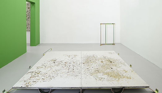 Parte integrante del percorso è l’installazione allocata nell’ambiente prospicente a quelli della mostra. Su un piano circolare, entro una leggiadra struttura metallica, sono adagiati frutti in vetro contenenti tracce di colore rievocativi di cassate e frutti di marzapane. Prova residuale della performance inscenata dall’artista il 17 settembre, giorno del suo compleanno, l’opera amplifica il senso di condivisione, coniugando festeggiamento e ricordo, esperienza sensoriale ed amore per i luoghi natii.