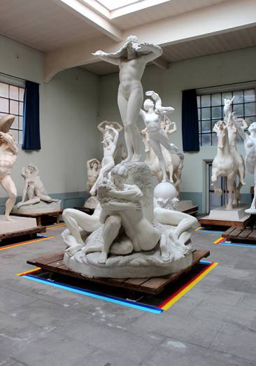 La secolarizzazione della società contemporanea ci ha allontanato irrimediabilmente dal soprannaturale. Eppure certi fantasmi ancora abitano le stanze dell’amore, dell’arte e dell’utopia. Fantasmi? Sono davvero tali? Il punto di domanda è necessario e a indicarne l’importanza è il titolo della mostra personale di Massimiliano Alioto, costruita su misura per i suggestivi spazi del Museo Hendrik Christian Andersen di Roma diretto da Maria Giuseppina Di Monte. “Ghosts?”, domanda il titolo. E chi sono? Lo scultore a cui è dedicato il museo, i suoi fratelli Andreas e Arthur e poi la sorella adottiva, la cognata, lo scrittore Henry James amato dal padrone di casa e l’architetto Ernest Hèbrard, sodale visionario. Riuniti, tutti insieme, per sottolineare una continuità necessaria, un dialogo impossibile, un’affinità elettiva oltre il tempo, suggellata nell’evidenza di un centenario: quello che separa l’anno di nascita dello scultore eponimo (1872) da quello di Alioto (1972). Il punto di partenza per questa mostra vibrante di memorie ed echi proiettati verso il futuro è un’intuizione acuta del curatore Gabriele Simongini, che ha invitato l’artista brindisino operante a Milano ad abitare gli spazi di quella che fu Villa Helene, con il beneplacito del Polo Museale del Lazio diretto da Edith Gabrielli. Teatro di un amore, di un fitto intreccio di relazioni familiari e creative e di un’utopia. Andersen sognava infatti di innalzare un suo World Communication Centre nelle campagne di Fiumicino, una struttura monumentale da destinare a grandi eventi, progettata come opera totale, articolata e grandiosa ma mai realizzata. A testimonianza di questo sogno restano le planimetrie e le sculture monumentali di gusto simbolista realizzate per questo scopo dall’artista statunitense di origine norvegese e romano di adozione. Le sculture, raccolte al piano terra del museo, sono protagoniste di un ambizioso intervento di Alioto, che si cimenta per la prima volta con un’installazione. Se l’arte è immaginifica e non solo mera descrizione della realtà, allora – suggerisce Alioto – può modificare la percezione del tempo e dello spazio, aprendo porte verso un altrove che si fa abitabile proprio in quanto immaginabile. Le sculture di Andersen, intrappolate in quella che fu la sua dimora, grazie all’intervento di Alioto possono finalmente raggiungere il luogo e lo scopo per cui sono state create. L’artista di oggi tende una mano verso l’artista di ieri e s’ingegna a completare il suo lavoro, immaginando aperture dello spazio-tempo attraverso le quali poter sollevare le sculture dalla loro collocazione attuale e trasportarle virtualmente verso la destinazione che avrebbe dovuto ospitarle. Per visualizzare questo vero e proprio dispositivo di teletrasporto, Alioto sottolinea semplicemente il perimetro del basamento delle sculture con delle strisce di carta di colori primari che evocano la scomposizione della luce, dilatando così nella percezione l’attimo prima della smaterializzazione, come in un effetto speciale hollywoodiano congelato nella sua incipienza. È l’incantesimo di un’arte che sovverte la fisica e vince la morte, tecnologia giocosa di un sogno liquido che attinge ai linguaggi del contemporaneo per restituire linfa a un passato che merita ancora una visione sugli schermi della nostra smemoratezza programmatica.