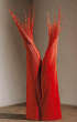 E proprio il rosso e il nero – i colori dell’inferno – sono i toni predominanti nella galleria; sono il nero delle tenebre ed il rosso delle fiamme mimate dall’unica grande scultura lignea al centro della sala: il Diavolo e la Diavolessa, abbracciati, si sviluppano in altezza come lingue infuocate, calde, vibranti nel colore e nel calore, nel movimento reso dalle listarelle di legno (le stesse delle Talebane visteMario Ceroli all’Istituto Superiore per la Grafica).