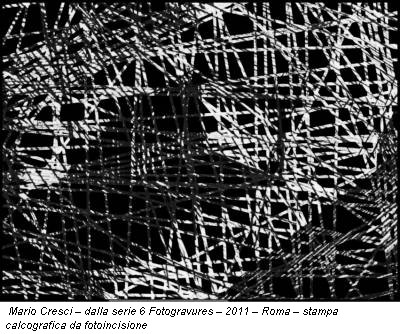 Un video proietta in sala fotogrammi dell’opera 6 Fotogravures (Roma, 2011, stampa calcografica da fotoincisione). Reticoli di segni incisi, fotografati e trasferiti su matrici calcografiche, riappaiono inchiostrati sulla carta. Oltre la fotografia. In Rivelati (Roma, 2011, stampa digitale su carta fine art), nove lastre, recto e verso di matrici, la luce invade i solchi incisi con effetti di sorprendente chiaroscuro, trascinando la natura del “negativo” in positivo.