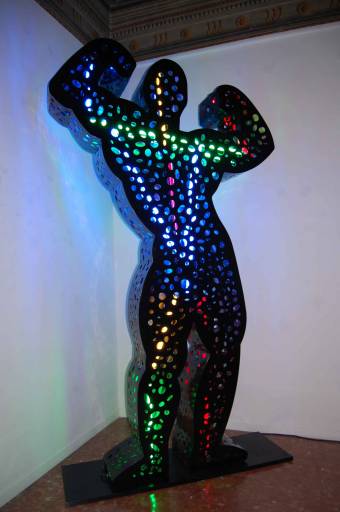 In una sala sono concentrati i lavori in perspex trasparente: da lontano rimane solo il disegno di luce. In un’altra, invece, lo stesso materiale – nella versione nera compatta – è illuminato dal retro. Opera unica, sperimentale, la grande sagoma di un body builder, che s’ispira a un’altra delle passioni dell’artista: il culturismo. Dalla superficie industriale ritmata da fori regolari s’intravede un’anima pulsante. Un’ispirazione che nasce dai vecchi libri di anatomia.