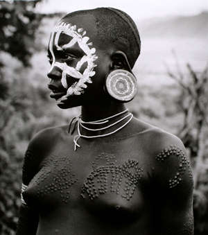 La grana fina della pellicola, i toni freddi e nitidi, certi sfondi neutri e quasi svuotati dell’aria rimandano esplicitamente alle vecchie documentazioni etnografiche; se ne allontanano il rapporto indissolubile –quasi da giardino delle delizie- tra gli uomini e l’ambiente e il fascino che emana dai dettagli applicati sui corpi (scarnificazioni, piattini d’argilla inseriti nelle labbra, pittura bianca ecc.). L’obiettivo se ne serve nei ritratti di gruppo per distinguere le tribù, li contiene a stento nei primi piani intensificando nei volti e nei profili l’apparenza della nudità.
