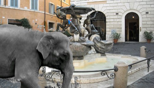 Fuori. Nel rumore dell’acqua le scimmie che fanno da statue viventi di colpo resuscitano le forme del monumento e le tartarughe di Piazza Mattei, già luogo tragico, che apriva e chiudeva il Ghetto della comunità ebraica. Allora forse il monumento è qui pensato come ammonimento? E i gibboni scimmiottano gli uomini?