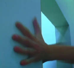 Il suono dell’ultima fatica di Puppi (Pordenone, 1970. Vive a Roma) è un battito secco, ripetuto decine di volte, alla fine s’imprime nella mente, come un ritmo semplice, ossessivo, allucinante. Altrettanto semplice e paradossale è l’azione mostrata nella video proiezione: l’artista salta per darsi lo slancio, quindi batte i palmi delle mani contro un muro, un’inquadratura ravvicinata ci fa vedere solo la parte superiore del suo corpo ed è il rumore dei colpi a scandire i movimenti ostinati, l’esercizio inconcludente. Che la sequenza continui ad libitum è naturale, perché in questa dinamica assurda – ma nitida – tanto è ovvio che la parete non ceda, quanto lo è che il protagonista non possa smettere di attaccarla. (e – aggiungiamo – è anche molto probabile che l’ignaro spettatore resista troppo poco al rumore martellante, per poter ipotizzare un’altra conclusione…)