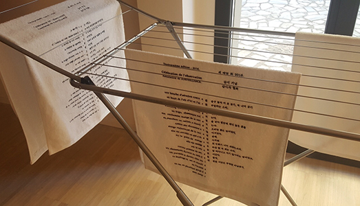 La Galleria ci accoglie con le sue sembianze da white cube, sobria e squadrata, relegando le opere dei dieci giovani artisti invitati (tutti studenti dell’Accademia reale delle Belle Arti di Bruxelles) in un mondo a parte, sacrale e controllato. È qui che il “raggio geometrico” evocato dal titolo della mostra (RADIEUSE deriva dal latino radius) collega centro e periferia, in un melting pot di scambi, scontri e incontri, fughe, ritorni, sconfinamenti in osmosi con il quartiere circostante, quello di San Lorenzo, e con Roma stessa più in generale. Perché questo progetto proviene sì dalla più algida capitale belga, ma i giovani artisti convitati si sono ibridati, prima della realizzazione delle loro opere, con un’insospettabile romanità, per giunta vespertina, in un confronto con le dimensioni e i concetti di alterità, identità, tempo e spazio scanditi nella città Eterna, tra pratiche, idiomi e linguaggi che ci richiamano alla mente i Caravaggeschi, così come le ultime due generazioni della Nuova Scuola Romana. È il caso, per esempio, di Minok AN, che ha letteralmente steso i panni in galleria con tanto di stendino. Il giovane autore sosterrà di aver tratto ispirazione per questa sua installazione (Festival de la Transpiration) da un’usanza coreana, che consiste nel donare tovaglie con ricami o testi stampati in occasione di cerimonie o altri eventi significativi della vita sociale. Ma nei suoi asciugamani ricamati e stesi, come non vedere la trasformazione di momenti comuni (i panni appesi e messi in bella mostra nei quartieri più popolari dell’Urbe) in momenti unici? Che poi è quello che ogni opera d’arte che si rispetti dovrebbe essere in grado di fare. L’arte, insomma, per il giovane Monik AN deve essere la celebrazione di qualcosa, e non deve ridursi a oggetto da portare a casa e appendere sopra il televisore.