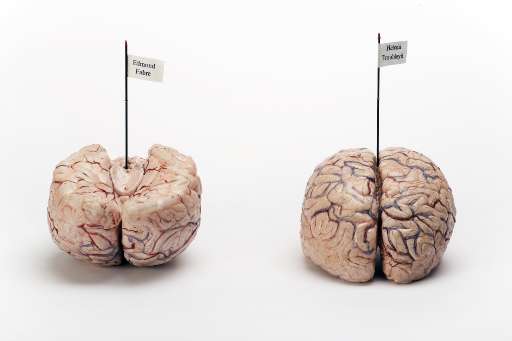 Quattro gufi, I messaggeri decapitati della morte, sono adagiati su una base vestita di lino e pizzo: lo sguardo è vitreo, immobile, ma spaventosamente umano. I cervelli di mia madre e di mio padre è un omaggio di Fabre ai genitori; due cervelli riprodotti perfettamente e realisticamente in gomma di silicone. “Credo nel corpo, la cui parte più sensuale per me è il cervello, perché credo nell’essere umano”, spiega l’artista.