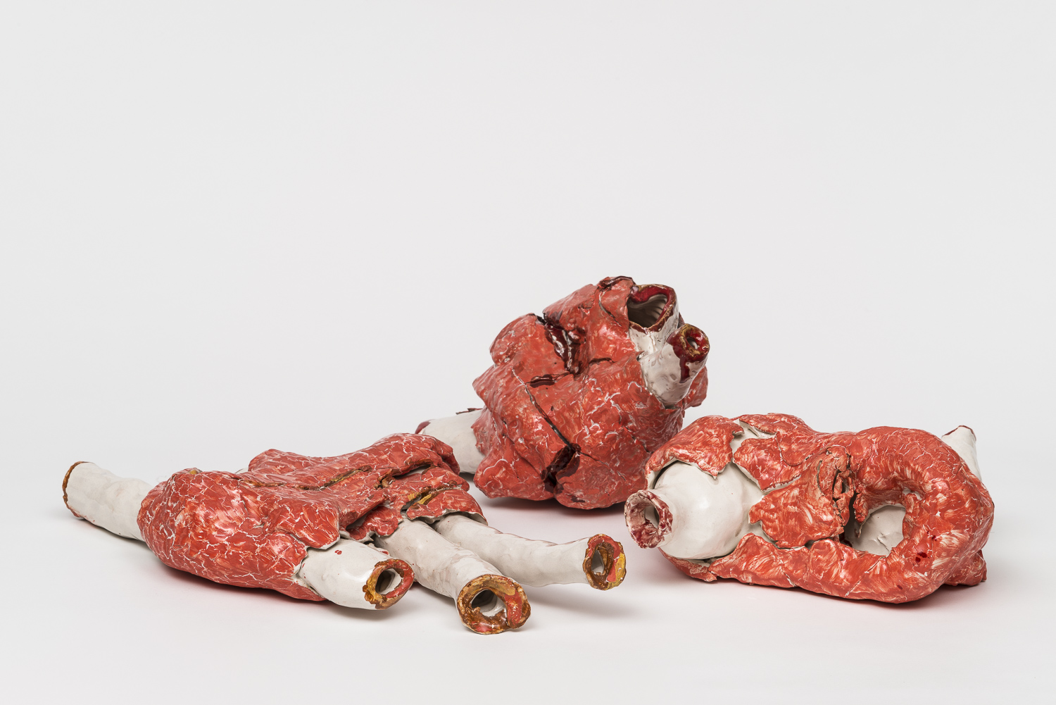 Camminando tra le opere, le forme, i riflessi dei colori smaltati, si ha la percezione di essere in prossimità di un resto. Un resto di che cosa? Una domanda che non smette di risuonare e che rischia di restare senza risposta, segno in effetti che la proposta artistica di Sabino de Nichilo (Molfetta 1972, vive e lavora a Roma) si rivela di un certo interesse. Organi da asporto è la prima personale romana dell’artista pugliese, fortemente voluta dalle artiste Francesca Romana Pinzari, Flavia Bigi e Gaia Scaramella per il loro L29 artstudio, uno studio d’artista aperto a collaborazioni e contaminazioni. Allievo di Riccardo Monachesi, Sabino de Nichilo si muove con disinvoltura all’interno del panorama scultoreo contemporaneo mostrando una sorprendente padronanza dei propri mezzi ed una convincente istintualità espressiva. La ceramica è il materiale d’elezione, docile e aristocratico: necessita di tempi lunghi e continue cure ma si presta ad indossare i colori più ammalianti.
