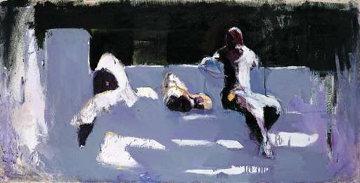 Alle campiture leggere e distese di un cielo sempre azzurro, fa da contrappunto la materia grumosa che si organizza in rapide concrezioni quando fanno la comparsa figure umane. E, inaspettatamente, un’ombra lunga e nera interrompe quel racconto lieve e delicato. L’uso smodato del bianco, non colore per eccellenza, marca l’estrema sintesi della visione. Una pittura che entra nelle viscere con la delicatezza di un’armonia e fa sognare di blu profondi che illuminino le notti.