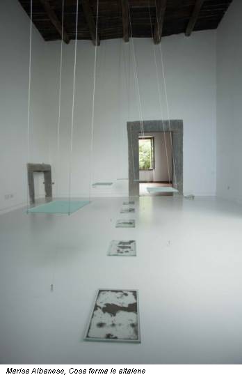 Nella seconda sala l’opera Cosa ferma le altalene è una fluttuante e poetica metafora del gioco e dell’infanzia. Il loro movimento col peso di impercettibili calamite traccia un segno su piastre vitree ma è talmente labile, mutevole e ciononostante inarrestabile. Insopprimibile esattamente come chi va in cerca di portare in salvo la propria vita. In donazione all’Istituto della Grafica, l’artista ha lasciato un video grafico: dopo un tremblement de terre, un nido cade e viene portato via. Senza un posto da abitare, senza la cura dei propri cari, senza riferimenti sicuri, né ricordi, la giostra continua la sua corsa. E se quel nido rappresenta un cassetto pieno di sogni? Dove vanno a finire? Per la mostra di Marisa Albanese, intensa e minimale, leggera e luminosa, sembra quasi di sentir parlare Sartre e di sentire il suo pensiero rovesciato: “l’uomo, la donna sono costretti a essere liberi” e a spostarsi di continuo… Ma di quale libertà si tratta, di quale viaggio?