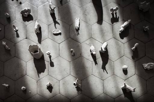 Sulla stessa linea d’onda, nella seconda sala, l’opera della Camoni presenta, organizzate sul pavimento, un ampio numero di piccole sculture di terracotta bianca, realizzate da bambini e adulti durante sessioni di lavoro insieme all’artista: anche qui, dal ruolo della luce naturale che scandisce e si posa sulla materia modellata, si passa alla riflessione sull’effettivo coinvolgimento dell’artista nella creazione. Una scultura realizzata da “non-artisti”, che prende vita grazie ad una ricollocazione operata e guidata proprio dalla Camoni, intenta a metterne in evidenza le peculiarità formali e materiche.