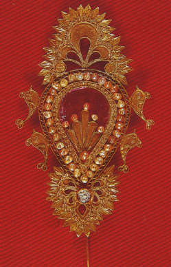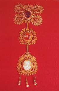 Possiamo rilevare come nei gioielli sardi una certa persistenza di alcuni schemi di particolare gusto arcaico – elemento comune a tutte le espressioni artistiche isolane – rivelino una limitata varietà di motivi decorativi, statici e spesso simmetrici, che trovano rispondenza nei modi artistici introdotti dalla cultura bizantina tra cui il pavone, ancora oggi impresso sui tappeti o intagliato nelle cassapanche lignee, o le rosette particolarmente stilizzate ed incise. I motivi decorativi provengono da raffigurazioni prevalentemente zoomorfe ed antropomorfe ridotte all’essenzialità della forma, dove le tecniche del traforo, bulino ed incisione rifiutano la ricerca della terza dimensione, rievocando gli antichi modi barbarici usati nella lavorazione di gioielli e metalli.