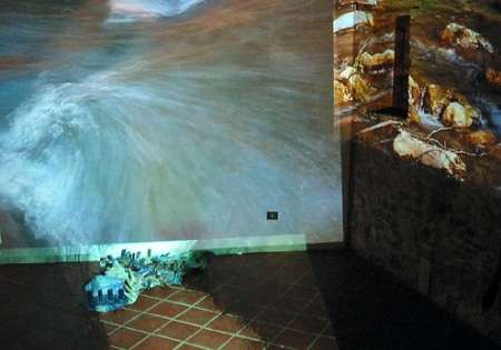 Ferma -immobile nel tempo e nello spazio- nella seconda installazione l’acqua è chiusa dietro un rettangolo di resina trasparente che finge d’essere l’invitante specchio d’acqua dal fondale rosso-blu. Quindi scende con prepotenza formando una cascata nell’unico allestimento esterno, immersa nel verde del giardino, chiudendo finalmente il lungo ciclo vitale. Il fragore della cascata si ripete, come se fosse l’eco, nella sala interna, dove nella video-installazione di Maria Paola Falqui l’acqua sgorga da una sorgente rocciosa.