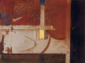 Se la parte iniziale dell’esposizione concede ampio respiro a tonalità scure e corpose, la seconda è dominata dal colore viola e, in modo particolare nelle ultime opere, dal rosso, elementi chiave del linguaggio pittorico di Wanda Nazzari. Quello della Nazzari è un percorso spirituale, una ricerca interiore sofferta che porta alla lacerazione, ma che lascia trapelare una luce di speranza. In questo senso, nelle sue opere, la distruzione non ha mai il sopravvento: l’essere vitale muore e risorge. Così ritornano i Frammenti incisi nel 1995, forme simili ad ali che alludono già al concetto di volo trattenuto. Ritornano le pittosculture, come le definiva Salvatore Naitza, veri e propri studi sull’incisività della luce. Ritorna il nido, dimensione ideale che richiama l’infanzia sofferta, rifugio sicuro di protezione ma anche di preparazione verso il mondo esterno. Partendo da Catarsi, si articolano le tre tavole lignee intitolate Di rosso e di viola nate nel 2003, frammenti lacerati da un lungo travaglio interiore, nel quale l’elemento vitale sopravvissuto alla catastrofe, s’insinua e vorrebbe prendere vita nella distruzione stessa. Nel terzo elemento della serie il colore rosso che esplode dalla tela, rivela come l’essere prima trattenuto, riesce finalmente a volare via.