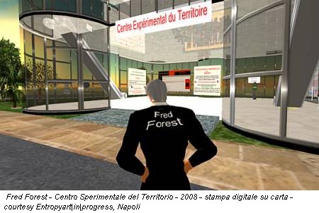 Gli scatti esposti, con l’avatar di Forest sullo sfondo delle sue costruzioni in SL, sono perciò rappresentazioni o, meglio, come l’artista specifica, “presentazioni” a carattere quasi documentario di un’opera-azione mostrata sul monitor piuttosto che opere in sé. Le foto dell’immaginifico e terribilmente pericoloso monolite mangia-rifiuti, monumentale fornace dal fascino quasi dantesco, o dell’avveniristico e startrekiano