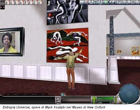 La situazione dell’arte nei mondi sintetici è abbastanza confusa. Infatti, mancando un’estetica che dia delle indicazioni per l’arte e l’architettura “in world”. C’è tutto e il contrario di tutto. Innanzitutto, come è stato già fatto in Second Life e nel museo di New Oxford in Entropia Universe (dove espongono Mark Kostabi, Ernst Billgren, Kika Karadi, e Mark DeMuro) si possono portare nei mondi virtuali opere vere, presenti nella realtà. Poi ci sono le gallerie dove espongono i dilettanti che usano con disinvoltura Photoshop, calcando la mano sugli effetti speciali e creando opere marcatamente oleografiche, con albe, tramonti e romanticissimi cieli stellati digitali. Seguono le gallerie/museo che propongono quadri famosi per arredare le case, come la SL Tate Gallery, dove ci sono capolavori universali, dalla Gioconda ai dipinti di Magritte.