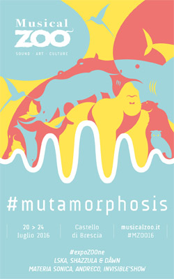 #expoZOOne2016 propone un folto programma di eventi espositivi all’insegna della contaminazione tra arti visive, sound performance ed estetica digitale, ideati e realizzati da artisti e performer di levatura internazionale provenienti dall’Italia e dall’estero, che si alterneranno nell’arco di 5 serate. Programma: – Mercoledì 20/7 PIXCELLS by LSKA (installazione interattiva, sound & video) – Giovedì 21/7 BLACK MASS RISING + KAZSBÂN by Shazzula & DâwN (proiezioni e performance audio-video-musicali) – Venerdì 22/7MATERIA SONICA a cura di D. Bonetta, R. Moratto, F. Volpi (mostra c/o AplusB gallery + performance audio-visiva) – Sabato 23/7 COSÌ E COSÌ + HOLIDAY INN a cura di Invisible Show (doppio concerto + performance) – Domenica 24/7 OVER(W)ALL ideato da Gabriele Falconi – a cura di Design In Corso (installazione audio-visiva) #mutamorphosis titolo scelto per questa nuova edizione è la crasi tra la parola metamorfosi e mutazione, un gioco di parole che vuol rappresentare la capacità del festival di cambiare sembianze, di mutare, riuscendo a rappresentare le diverse anime che lo rendono qualcosa di unico. Rock, techno, reggae, house, hip-hop, world music, arte contemporanea, conferenze, food & beverage, sempre con l’indice puntato verso ricerca, sperimentazione e qualità.