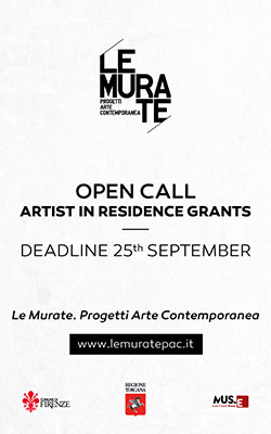 Le murate Progetti Arte Contemporanea in collaborazione con il Comune di Firenze, Centro di Ricerca Produzione e Didattica Musicale Tempo Reale e la Fondazione Studio Marangoni e con il sostegno della Regione Toscana nell’ambito del progetto regionale “Toscanaincontemporanea 2016” si propone di assegnare tramite bando due borse ad artisti che lavorano con i linguaggi del contemporaneo. OPEN CALL PER RESIDENZA D’ARTISTA RESIDENTE IN TOSCANA Il bando “Open call per residenza d’artista residente in Toscana” che prevede l’assegnazione di un contributo complessivo e onnicomprensivo di 2.000 euro è rivolto a: A) artisti under 35 residenti o operanti in Toscana che presentino un progetto inedito per produrre un nuovo lavoro ed una mostra; B) artisti over 35 residenti o operanti in Toscana che presentino un progetto inedito che coinvolga studenti o giovani artisti under 35 del territorio toscano in un workshop o in produzioni che prevedono un momento di restituzione pubblica. Maggiori info su http://www.lemuratepac.it/open-call-per-artisti-residenti-in-toscana-e-open-call-internazionale-per-residenze-dartista/ OPEN CALL PER ARTISTA Il bando “Open call per artista” che prevede l’assegnazione di un contributo complessivo e onnicomprensivo di di 6.000 euro è rivolto a: A) artisti under 35 che presentino un progetto inedito per produrre un nuovo lavoro ed una mostra; B) artisti over 35 che presentino un progetto inedito che coinvolga studenti o giovani artisti under 35 del territorio toscano in un workshop o in produzioni che prevedono un momento di restituzione pubblica. Maggiori info su http://www.lemuratepac.it/open-call-per-artisti-residenti-in-toscana-e-open-call-internazionale-per-residenze-dartista/
