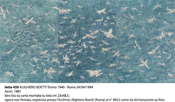Tra le opere in arrivo, si segnala un lavoro di Alighiero Boetti del 1983, Aerei, una piccola carta a biro blu montata su tela (23×48,5 centimetri) che andrà all’ incanto sabato prossimo con una base d’ asta di 60 mila euro e una stima di 110-120 mila.