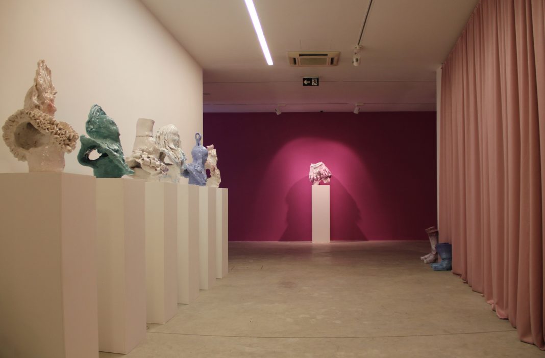 Mezzi busti, sculture dalle grandi e piccole dimensioni -tutte in ceramica- sono vestite da abiti suntuosi e appariscenti che tra pizzi, merletti, sete abbracciano corpi e celano anime impossibilitate ad esprimersi. Sembra come se si muovessero tra banchetti e feste regali dove i diktat riecheggiavano spietati e dittatoriali. Sguardi, gesti e codici di un’espressività tanto silenziosa quanto potente trovava la sua libertà nei retroscena delle corti più fascinose, dove il buio regnava sovrano, le mani si legavano e i cuori battevano all’unisono. Cos’è in fin dei conti un vestito se non una seconda pelle nella quale muoversi? Ma è proprio quella la pelle che si vuole abitare? Oppure, sotto a quelle preziose stoffe magistralmente cucite, c’è una fluidità che va oltre l’apparenza e scava in profondità dove solo un occhio attento e sensibile può arrivare?