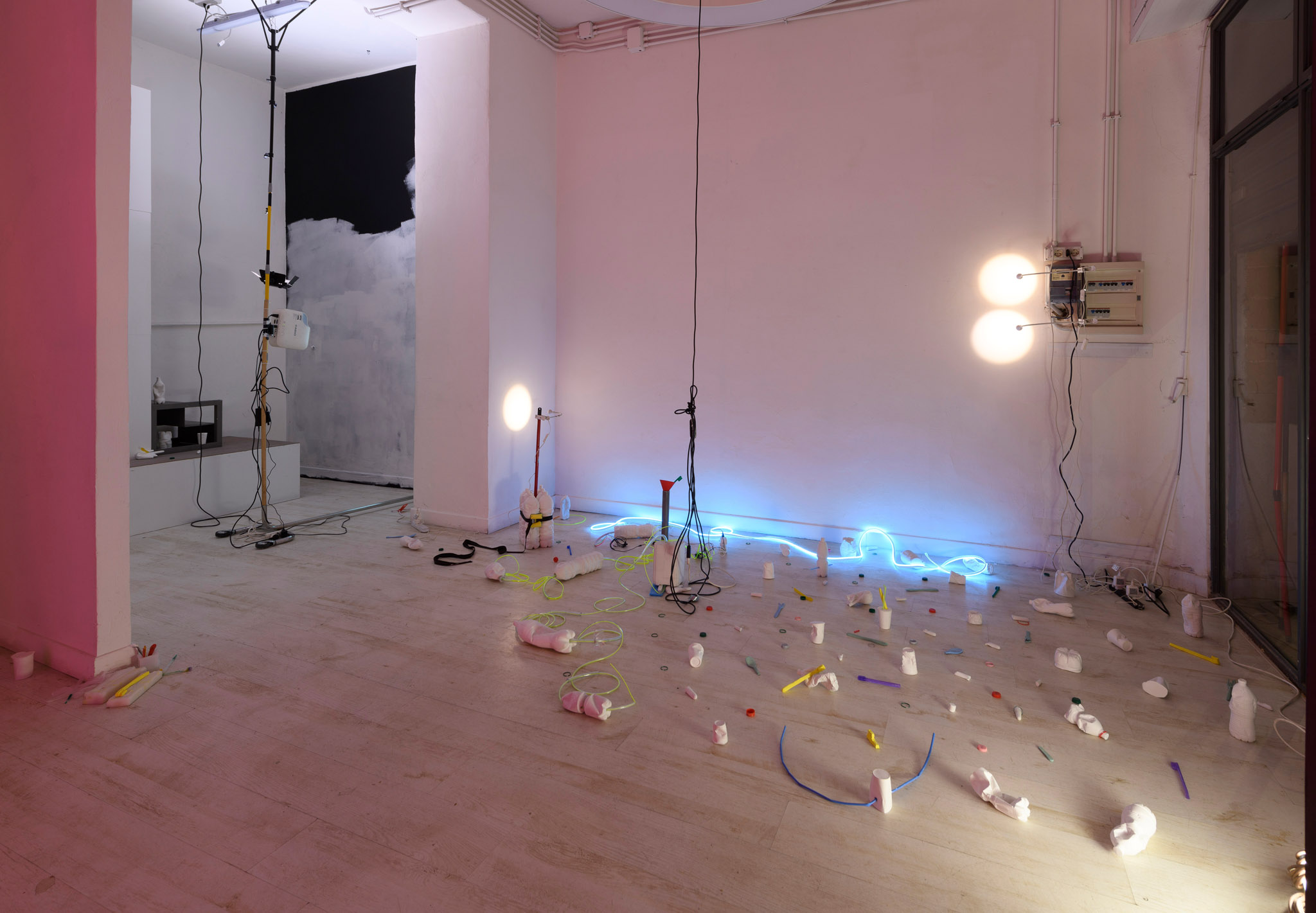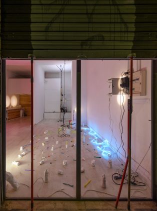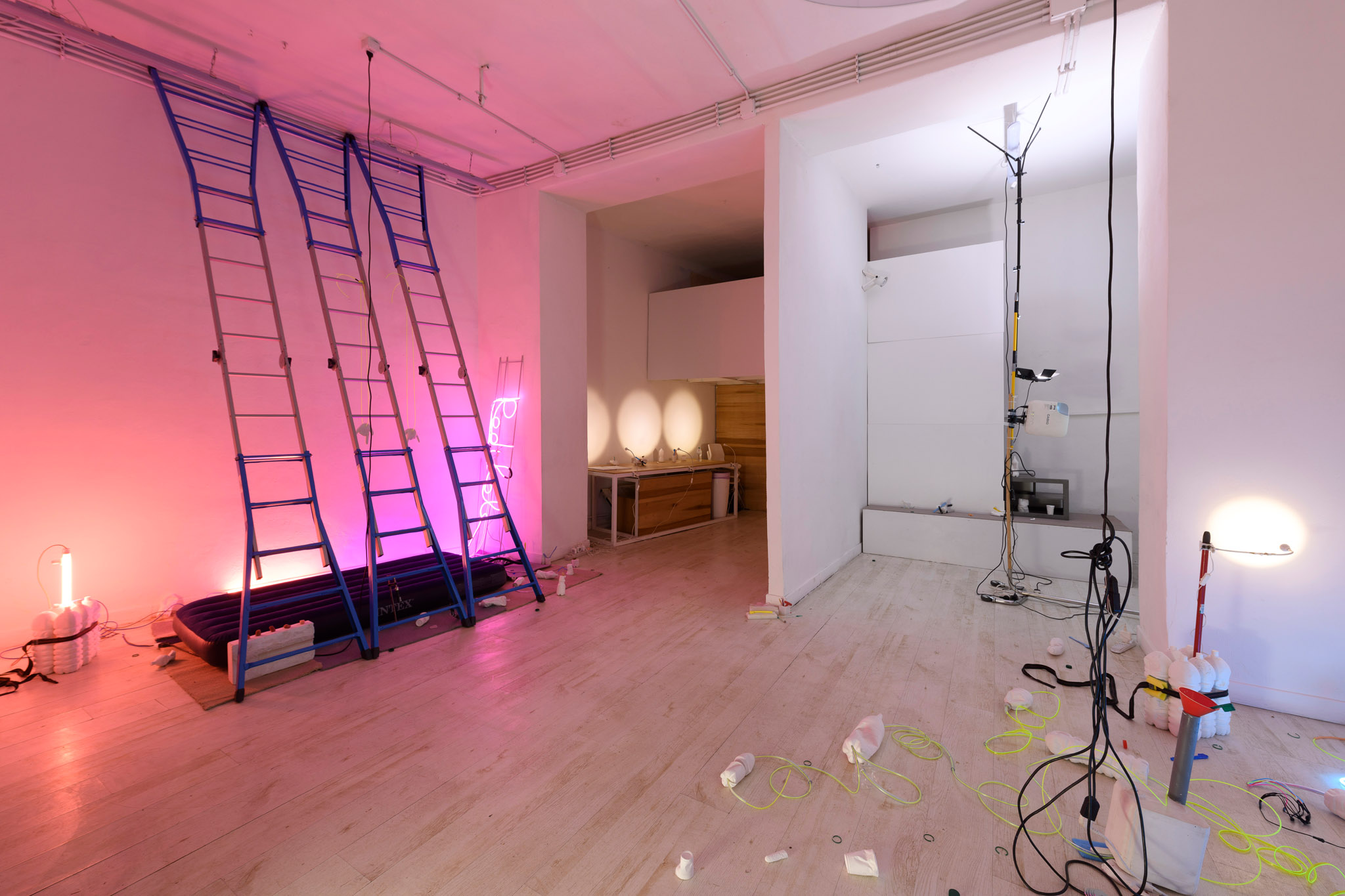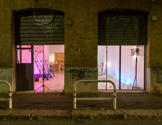 In un caos ordinato, una disposizione rigorosamente sregolata, Gian Maria Marcaccini orchestra un ensemble di oggetti armonizzati in una logica tendente al detournement: estrapolare un qualcosa dal suo contesto abituale, per restituire un altro significato scaturito dalla collocazione in un nuovo contesto. In tutta la sua incertezza, ogni cosa si riafferma in questo ambiente in cui riaffiora un ricordo di dimora, è un abitare l’incerto. Le serrande semi abbassate, le scale inclinate e un materassino sdraiato sono le tracce di un vissuto interrotto che si rivela qui senza soluzione di continuità, “radikale”. Lo vediamo nel processo creativo proiettato con un piccolo video su di una parete nera ricoperta da un bianco insicuro, anch’esso interrotto.
