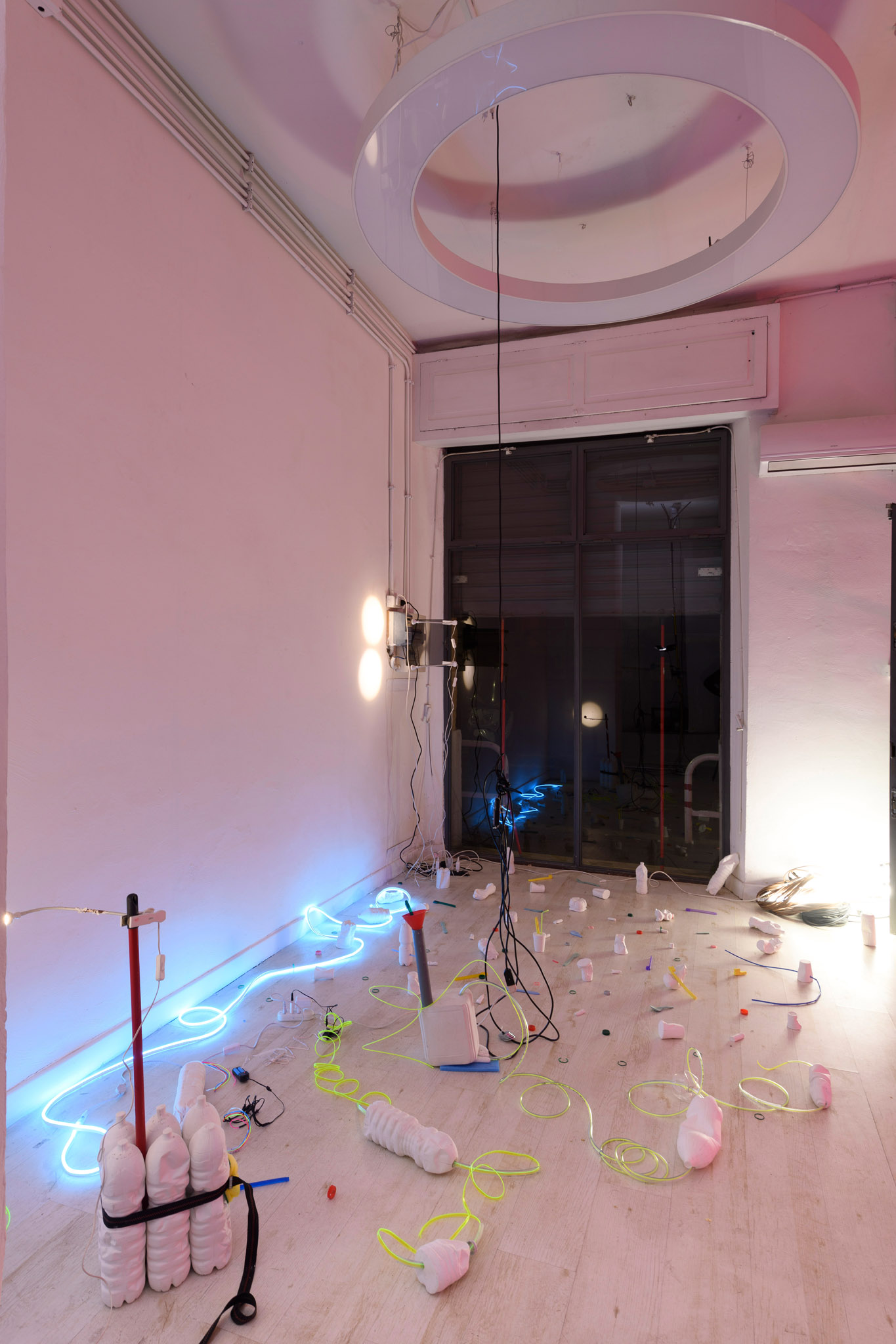 Tra le pareti di Curva Pura si espande l’installazione di Gian Maria Marcaccini, l’ipotesi di un’assenza lascia totalmente spazio alla presenza dell’oggetto. Un habitat, un ambiente, un sistema di oggetti: è l’opera di Gian Maria Marcaccini, accompagnata dall’interrogativo che dà il titolo alla mostra “Mi presti il tuo spazzolino?”. Sono oggetti “testimoniali”, come li definisce la curatrice Nicoletta Provenzano: «parte di un vissuto quotidiano, riattualizzato in un rapporto di reciproca rispondenza o di dialettica opposizione sintattica». Così l’artista rimodella lo spazio di Andrea Romagnoli e Vittorio Beltrami, illuminandone anche i particolari più inosservati, dal ciano al bianco, al magenta.
