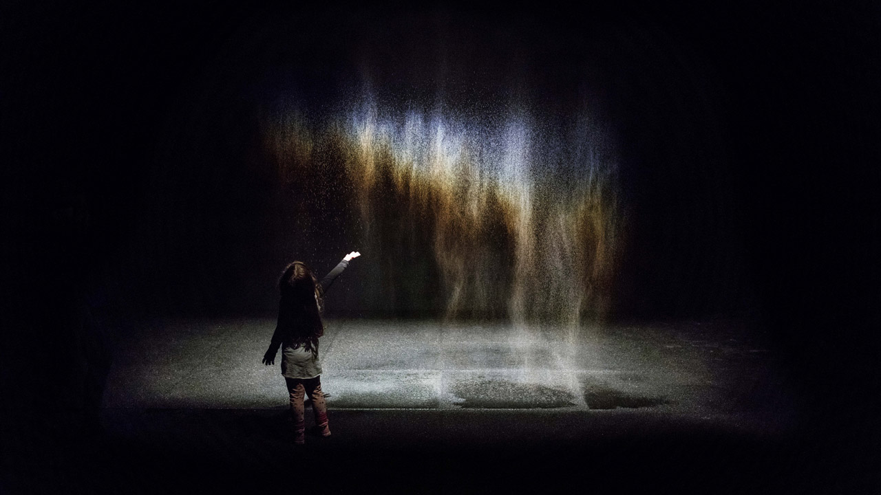 Ogni lavoro ha del monumentale e dell’effimero: monumentale in termini di dimensione e di importanza; effimero, perché momentaneo e creato per un’esperienza dal vivo. Entriamo in spazi dove il nostro riflesso viene frammentato e distorto. In Moss Wall, siamo invitati a toccare un’enorme parete di muschi scandinavi, in una sorta di contemplazione tattile. In Big Bang Fountain ci troviamo in una sala completamente buia dove uno spruzzo d’acqua viene illuminato da una luce stroboscopica, dandoci l’illusione di un’apparizione intermittente e miracolosa.