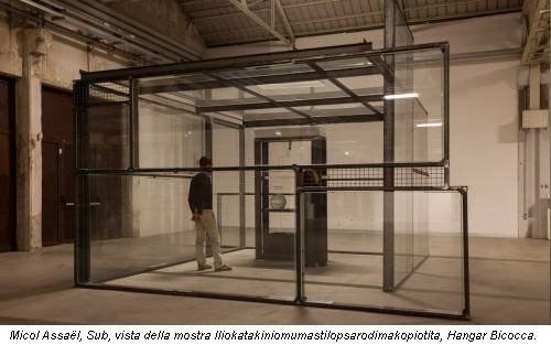 Conclude il viaggio oltre il ventre della modernità, ai confini di un tempo indecifrabile, dove l’individuo sembra un ospite sgradito, Sub, l’ambiente in vetro, realizzato appositamente per l’Hangar Bicocca attraverso l’assemblaggio di alcuni espositori in vetro e ferro progettati dall’artista e utilizzati per mostrare i disegni della serie Inner Disorder (1999-2001), in occasione della mostra itinerante Fomuska (2009). Queste vetrine ricombinate in una struttura geometrica trasparente, prendono nuova energia e si trasformano in un dispositivo funzionale dell’opera. Il visitatore, dall’esterno o dall’interno, assiste al fenomeno della nascita di cariche elettrostatiche prodotte da un “generatore Kelvin”: un dispositivo che utilizza gocce d’acqua in caduta per generare differenze di tensione per induzione elettrostatica che si verifica tra i sistemi interconnessi di carica opposta. Assaël materializza una dimensione processuale ed evolutiva, con macchinari pesanti che mettono in evidenza pericoli, disagi, dissonanze insite nella routine della vita di ciascuno. Il suo approccio “politecnico” è transnazionale e affronta campi d’indagine innovativi in cui attraverso effetti “alchemico-industriali” non si celebra la ricerca scientifica o il sensazionalismo fine a se stesso, ma al contrario si valutano le sensazioni che esse producono sull’individuo.