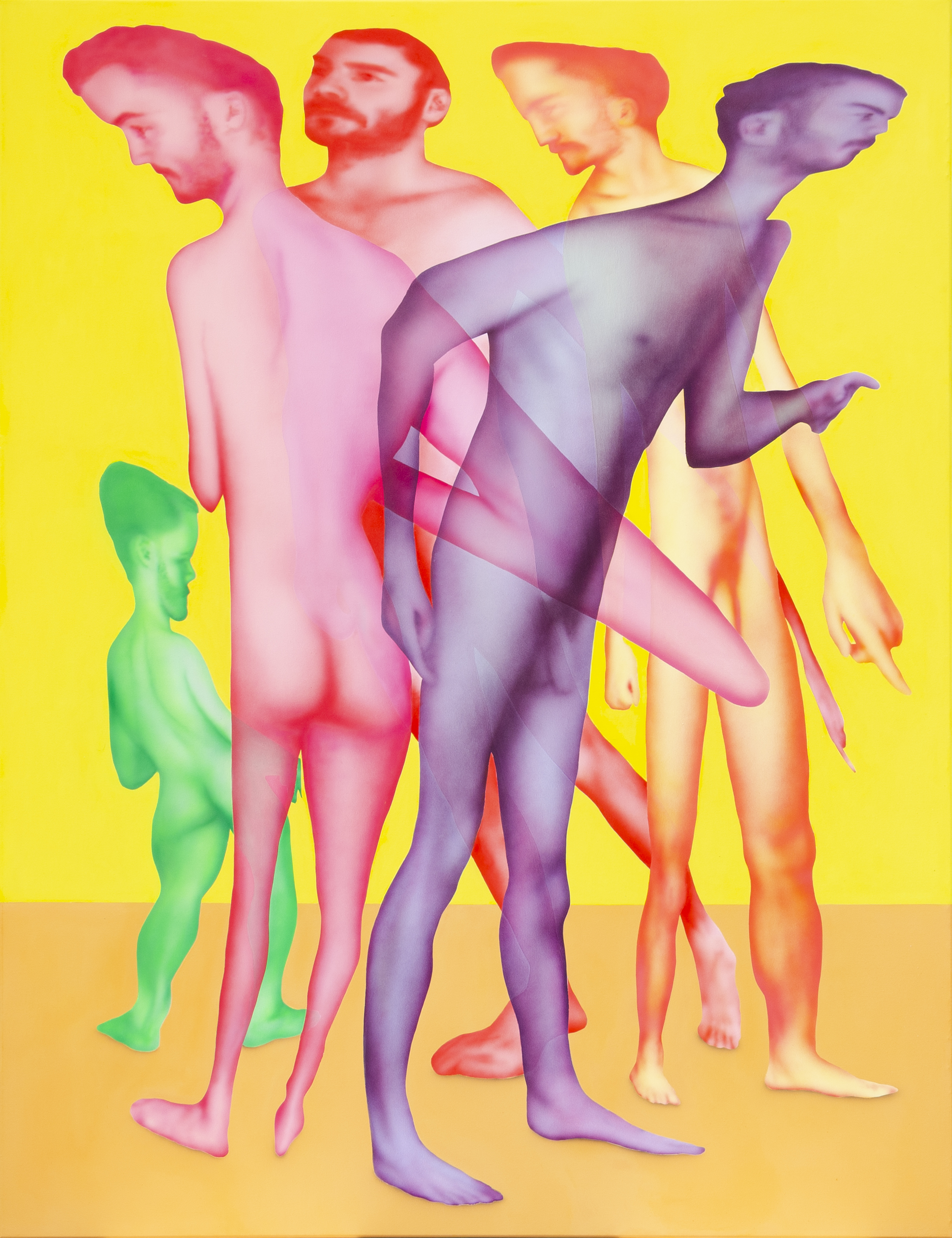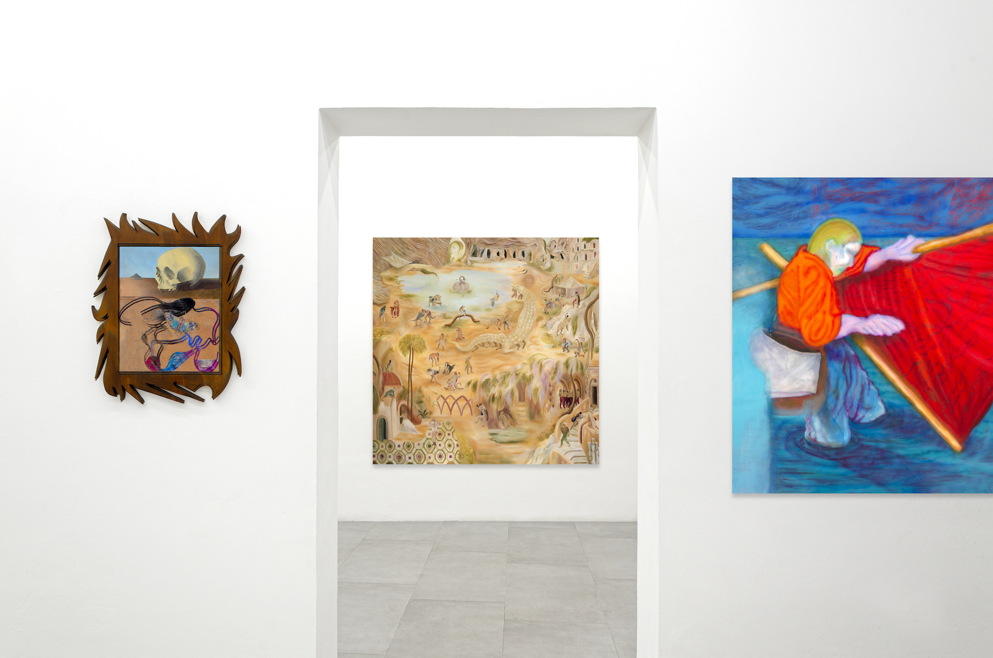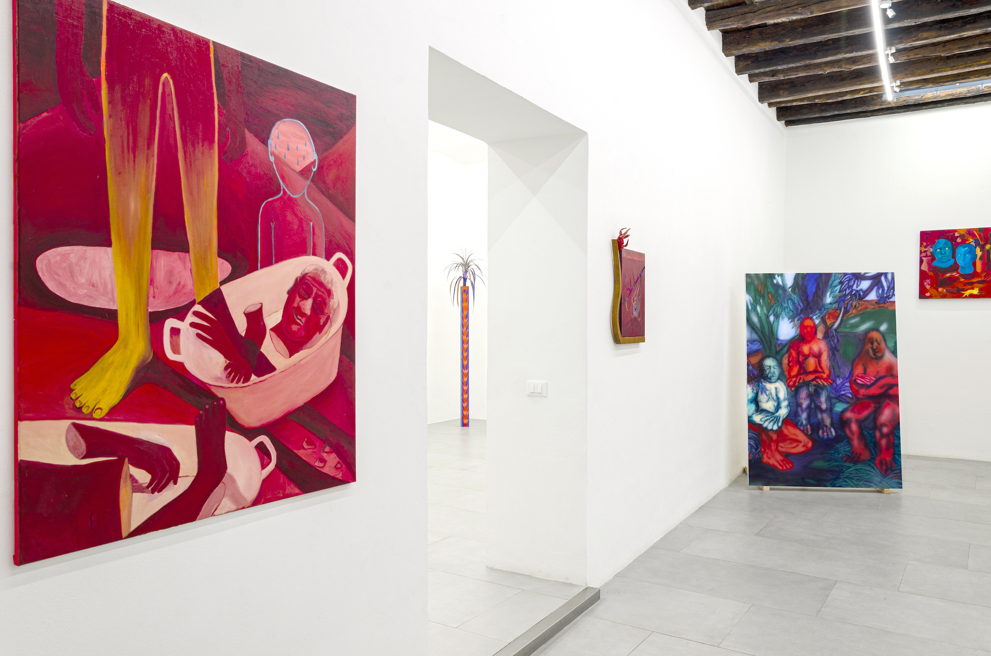 Entrando in galleria veniamo accolti da tre opere di Gabriele Ermini. Sono opere “dichiaratamente figurative”, dalle prospettive distorte e un senso coloristico che rimanda a Nicolas Party. “Una pittura fatta di corpi, forme, segni, simboli, campiture, elementi grafici e caratterizzata dall’utilizzo spesso contemporaneo di più tecniche e più strumenti, pennello, spray, aerografo, cercando di maturare e mantenere una ricerca formale in battaglia con la retorica del dipingere”.