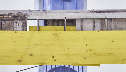 La mostra “Gradi di tensione” alla galleria di Francesco Pantaleone consiste in una grande installazione che occupa e sfrutta l’intero spazio espositivo. Giovanni Termini, come ci racconta la curatrice Agata Polizzi: “…s’interroga sulla possibilità di ripensare ad uno spazio intimo e nascosto, interiore, spesso invisibile, luogo di sperimentazione in cui ciascuno prova a reinventare i contesti”. La reinvenzione del contesto avviene grazie al tensionamento di una struttura metallica che flette una barra orizzontale trattenuta dall’altro capo di una fettuccia da un assemblaggio di tavole di legno, finestre e porte vecchie. La fettuccia che trattiene in sospensione tra i pilastri della galleria l’intera struttura, è il segno distintivo di un problema centrale per molti artisti contemporanei: rendere partecipe il pubblico di uno stato di sospensione secondo il quale non è il suo sguardo a completare l’opera ma l’ansia dell’attesa di un suo collasso.