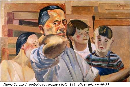 L’impaginazione aggettante dell’Autoritratto con moglie e figli (1948) sposta all’esterno il focus della tensione esistenziale che satura il dipinto. È questa l’opera che testimonia maggiormente la riflessione di Corona sulla propria condizione d’artista: ricusata con sofferenza in cambio dell’amara certezza di uno stipendio da insegnante, di fronte alla necessità di mantenere ben sei figli. Ma secondo Lacagnina è il grande bozzetto per un’ignota Gigantomachia, inaspettatamente saltato fuori da un angolo di casa Corona, a fissare simbolicamente il crollo dell’antica ambizione di “vivere d’arte per l’arte” sotto il peso del presente antieroico. Viene così restituito il temperamento disincantato ma tenace dell’artista che, durante gli ultimi dieci anni di vita, volle ricostruire a posteriori la propria produzione futurista, perduta sotto le bombe del ‘43, e ricucì insieme i pezzi del puzzle esistenziale della propria storia sulle pagine di un diario intimo, alcuni brani del quale appaiono per la prima volta nel catalogo di questa mostra.