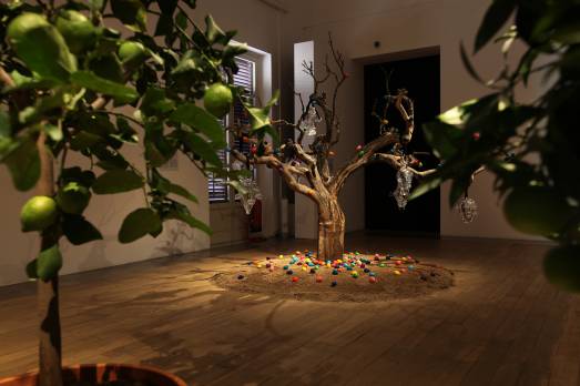 All’interno del Palazzo figurano opere iconiche, tutte di assoluto valore, tra cui segnalo The Claearing (2015) di Nathalie Djuberg e Hans Berg, meta apprezzata da moltissimi bambini per la fantasiosa e apparente atmosfera fiabesca; l’emozionante e totalizzante Object defined by activity (2009) di Olafur Eliasson; la storica installazione di sculture Variation on Color Seed Space Time Love (2009) di Ernesto Neto, con la sue reti colorate che imprigionano varietà di fagioli, simbolo della sostenibilità relativa al cibo e all’ambiente. Poi, in un antro quasi segreto, si materializza Wood 7 (2018) di Francesco De Grandi, installazione site specific che avvolge nella tenebrosa esperienza di un bosco, dove il rapporto diretto con la pittura si fa letteralmente esperienza sensoriale, un mondo sconosciuto imprevedibile e misterioso, senza tempo, una sorta di “porta ultraterrena” attraversando la quale è possibile tutto o il contrario di tutto. Infine un’atmosfera ecumenica e pacificata è offerta da Survival Tree di Pascale Marthine Tayou, opera potente, un sincretismo di simboli e identità che rimarcano la bellezza di una cultura condivisa e sinceramente universale.