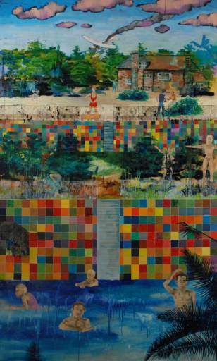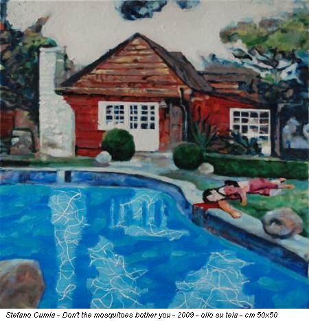 Non ti danno fastidio le mosche?, grida il titolo di uno dei quadri di Stefano Cumia (Palermo, 1980). Un cottage rosso appare sullo sfondo di un ordinario paesaggio di campagna, mentre in primo piano l’azzurro cloro della piscina catalizza l’attenzione: sul bordo giace il corpo morto di un uomo. Il sangue rosso vivo sfiora appena l’acqua cristallina.