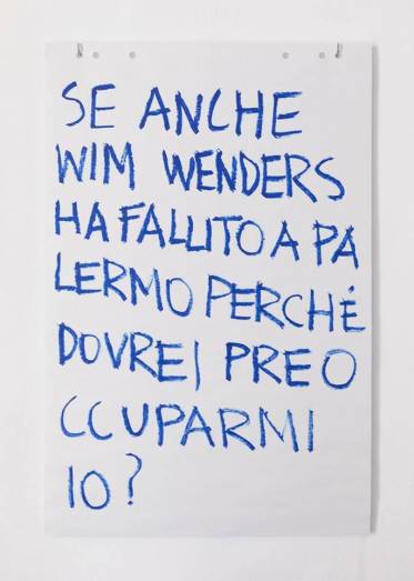 “Se anche Wim Wenders ha fallito a Palermo perché dovrei preoccuparmi io?” recita con animo ironico uno dei manifesti appesi sulla parete testimoniando il soggiorno dell’artista Alessandro Calabrese (Trento, 1983) durante la prima settimana di apertura di Casino Palermo. Una frase che indubbiamente fa riferimento al film del regista tedesco intitolato Palermo Shooting a cui si aggiungono altre raccolte dall’’interazione ludica con l’intorno. “Ho riportato in questi grandi fogli di lavagna riflessioni, citazioni e aforismi che hanno funzionato come stimoli sorti dal dialogo con i palermitani, dalle lunghe passeggiate mattutine e delle chiacchierate notturne con l’intento di cogliere l’anima della città in tutte le sue sfaccettature”.
