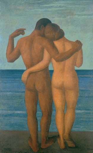 La mostra dedica particolare attenzione alla fase novecentesca della produzione di Rizzo portando alla luce opere inedite come Nudo Seduto del 1938 o Adamo ed Eva del 1932, recentemente restaurata; in quest’ultima l’adesione a Novecento nasce da un armonioso intreccio tra forma classica e atmosfere da realismo magico. I corpi nudi di Adamo ed Eva si avviano uniti verso l’azzurro intenso del mare: le forme si stagliano nitide e precise sullo sfondo seguendo un attento ritmo di luce e colori.