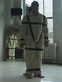 Dentro il Micromuseum John Lovett ed Alessandro Codagnone saranno bendati e indosseranno il SUIT (creato per l’evento), cui allude il titolo della performance. Tute bianche, intere, cucite l¹una all’altra posteriormente. Braccia e gambe saranno strette da tiranti neri in un’unica imbracatura simile a quella dei paracadutisti. Gli artisti saranno così attaccati schiena contro schiena, e pressocché immobilizzati dalle spalle alle gambe.