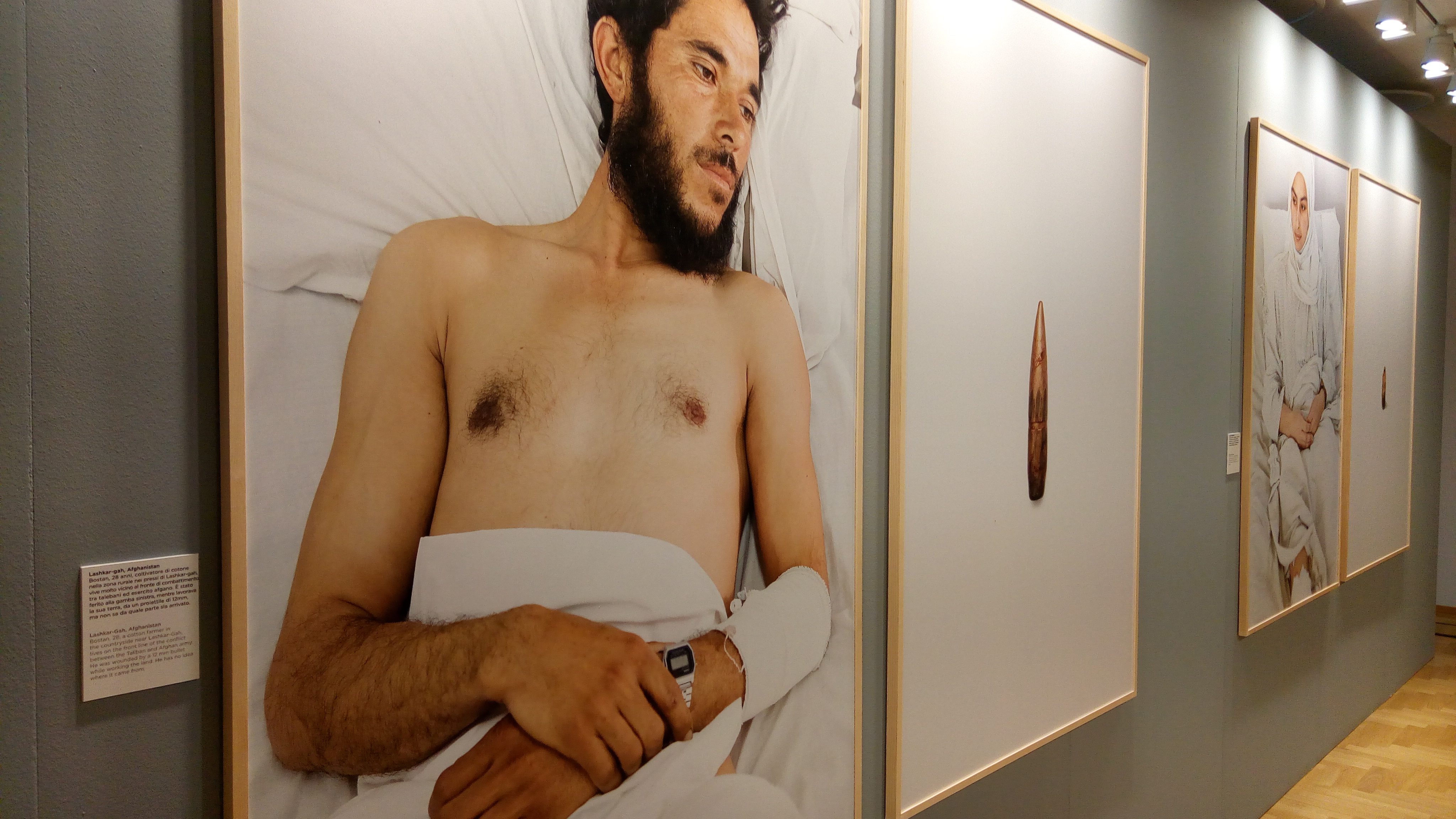 “Zakhem” – titolo della mostra fotografica in esposizione a Casa Emergency di Milano fino al 9 giugno -, in Dari, vuol dire “ferite”, che vengono rappresentate nelle immagini in due modi: nel momento del soccorso e dell’intervento chirurgico cui sono sottoposte le vittime nei centri chirurgici di Emergency a Kabul e Lashkar-gah, nell’Helmand, e nel dittico formato dalla foto della persona ferita, accostata all’immagine dell’oggetto che l’ha colpita. Proiettili rimasti perfettamente interi oppure ordigni, mine e razzi andati in mille pezzi, provenienti non solo dai talebani ma anche dai militari che dovrebbero difendere la popolazione o, addirittura, da entrambi i fronti, secondo la testimonianza diretta di Piscitelli, raccolta nel catalogo della mostra.