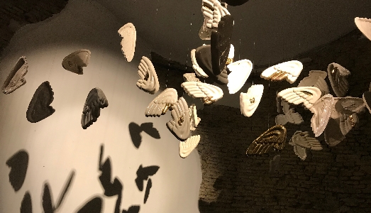 Al visitatore si offre l’esperienza di un momento di sospensione, in cui la scultura vince la forza di gravità e si fa leggera, aerea, trasognata. Le ali che Monachesi moltiplica usando la creta, il materiale privilegiato della sua ricerca, realizzando calchi a partire da uno stesso modello rispondono a un meccanismo tipico della sua produzione, che fa della ripetizione, della serialità e della modularità il suo punto di forza, assecondando un istinto più architettonico che plastico. La creta, smaltata di bianco e impreziosita da pennellate d’oro, stavolta perde però la sua pesantezza terrea e si eleva sulla testa del pubblico, fino a comporre una nuvola disordinata che un movimento d’aria trasforma in un tintinnabulo tanto grande quanto prezioso, con la complicità degli echi che la cupola amplifica.