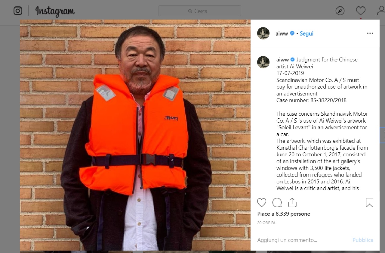 A maggio, Weiwei citò in giudizio il distributore danese della Volkswagen, la Skandinavisk Motor, dopo aver appreso che Volkswagen Denmark aveva usato alcune riprese di Soleil Levant, l’installazione composta da 3500 giubbotti di salvataggio color arancio brillante, per la campagna pubblicitaria della Polo, nell’ottobre 2017. L’opera, realizzata per il World Refugee Day e allestita sulla facciata della Kunsthal Charlottenborg di Copenaghen, racconta la pericolosa traversata dei migranti, passando dalla Turchia per arrivare a Lesbo, in Grecia, e nella pubblicità compare chiaramente.
