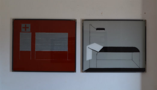 Troviamo Ricostruzione, geometrica stilizzazione di pieni e di vuoti che danno origine a un paesaggio spettrale su un fondo rosso sangue, allusivo alla tragedia del terremoto nelle Marche del 2016. Accanto, è posto l’abile gioco di ombre di Trasparenze, in cui un asciugamano è letteralmente steso sulla parete che gli fa da sfondo, mentre Altalena e Faccia a faccia richiamano la decontesualizzazione degli oggetti tipica delle Avanguardie.