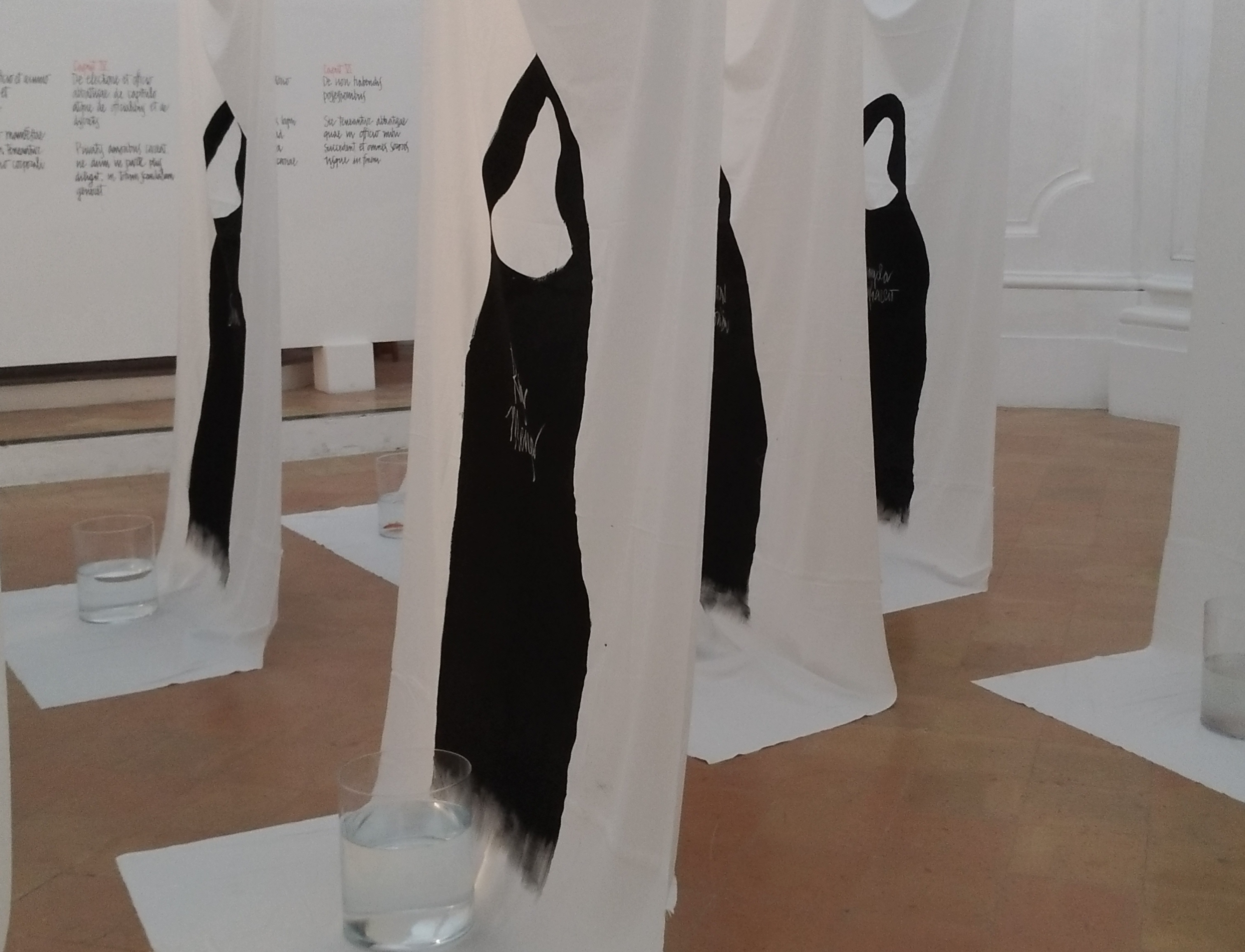 16 teli sospesi nella chiesetta dell’Immacolata sul Castello Aragonese raccontano la fine di esistenze di cui nulla sappiano nella realtà, sospese come anime vaganti tra le mura del maniero, distaccate da quei corpi che sono stati adagiati per secoli sulle seggiole del piccolo cimitero a raccogliere i loro umori mortali nel sottostante Putridarium. Accadimento tanto macabro quanto velato del religioso sensus mortis, ben espresso anche dall’installazione sonora costituita dallo scroscio continuo dell’acqua e dalle piccole ampolle contenenti dei pesciolini rossi guizzanti, ultimo sospiro di vita che incrocia il movimento dei teli esposti alla luce, cui fa da controcanto un perpetuo Lux Aeterna di György di Ligeti, cantato da sedici voci che, pur con la stessa melodia e le stesse parole, creano un armonico contraltare musicale. L’installazione sonora di Giampaolo Vitelli immerge nell’esperienza sensoriale totale con cui la mostra è stata realizzata. Dal ritratto figurato delle monache rappresentate dai teli, di cui ci resta un accenno alla loro vocazione, con l’abito monacale e i loro nomi vergati sopra; alle intuizioni sonore date dallo scorrere dell’acqua, che allude al perpetuarsi nel tempo di uno spazio infinito, che narra la fine inconsueta cui venivano sottoposti i loro cadaveri; fino alla percezione della memoria, aiutati dalle tavole rievocanti i capitoli della celebre Bolla papale di Innocenzo IV sulla regola della vita claustrale. (Anna Di Corcia)