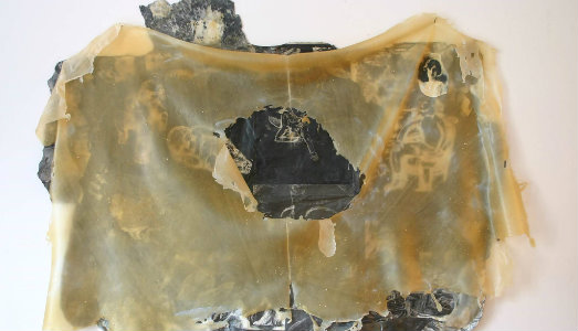 Nel catalogo della mostra c’è spazio anche per l’amico e psicanalista Giovanni Castaldi, che sottolinea come l’albero, nell’immaginario di von Hessen, è simbolo genitoriale. Comparso come materiale nelle sue opere dalla morte del padre, che così libero dalla carne e intriso di ricordo, può rivivere nell’immaginario dell’artista come puro desiderio. Utilizzato direttamente come materiale di fondo che accoglie le sue figure, o richiamato in forma dagli acquarelli o rievocato nel contorcimento di pantaloni e lana (forse gli stessi pantaloni utilizzati per vagare nel bosco?) come nell’opera Tronco blu del 2017. Poi seguono i lavori con la pelle, in particolare Grotta dei Misteri. Qui il lattice sta per la pelle stessa dell’opera che è poi la pelle dell’artista. Al di sotto ci sono dei disegni che restano tuttavia celati sotto lo strato di lattice. Forse l’opera in sé non ha nulla da mostrare o, meglio, mostra ciò che non è in mostra: l’intimità, lo spazio privato, il segreto. Tutti i lavori mettono in luce, di volta in volta, un lato dell’artista, parlando di lei o per lei, al punto che l’intera esposizione potrebbe avere per titolo: “Autoritratto”, ma ha invece “Al Fondo della storia” perché è vero che l’artista parla di sé, ma di riflesso dice di noi, di come siamo, di ciò cui aneliamo, a metà strada fra la contingenza e la spiritualità, da cui la società contemporanea sembra essersi allontanata. Un percorso, quello di Elena von Hessen, che esce dalla linea ufficiale dell’arte, per porsi in posizione outsider. (Marcello Francolini