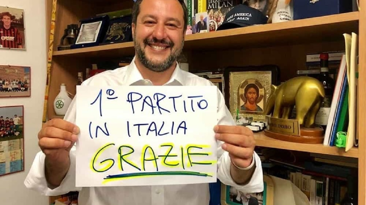 Matteo Salvini, leader della Lega che una volta era Nord, ringrazia 9 milioni di volte gli italiani – 34,3% dei votanti – ma punta tutto sull’immagine, con una foto di quello che sembra essere il suo studiolo, tra tapiri dorati, icone sacre, berretti di carabinieri e foto vintage del Milan. Un caos scenografico, falso come può esserlo una realtà stereotipata e mediocre, perché si sa che lui è proprio come noi, noioso, ordinario e prevedibile, quindi tranquillizzante.