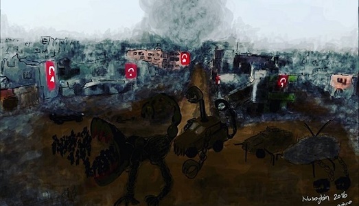 Zehra Doğan è una pittrice e giornalista turca di origine curda che è stata condannata a 2 anni, nove mesi e 22 giorni di carcere per aver realizzato un dipinto che raffigurava la distruzione causata dalle forze di sicurezza turche nel quartiere Nusaybin, della provincia di Mardin, una regione curda in Turchia.